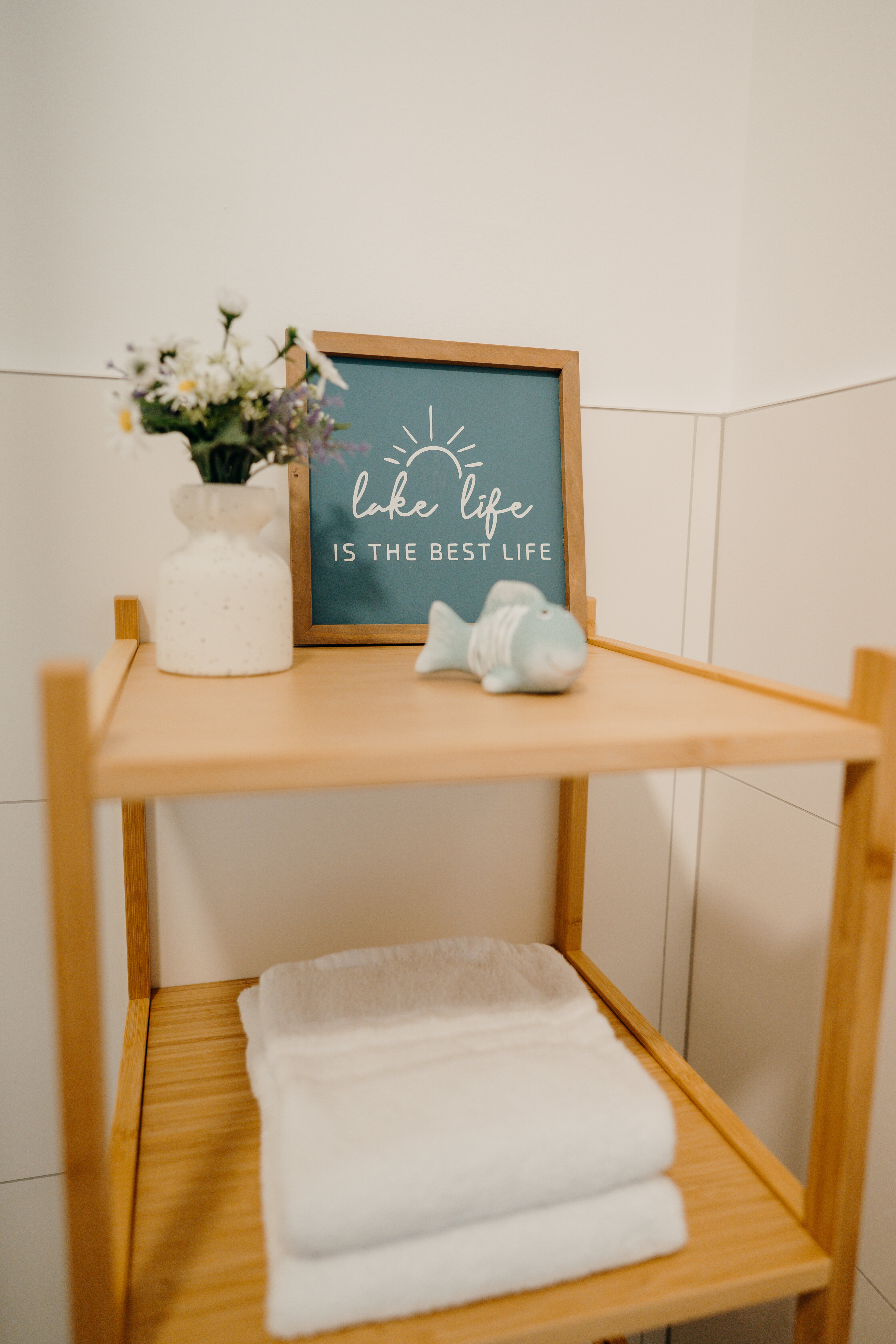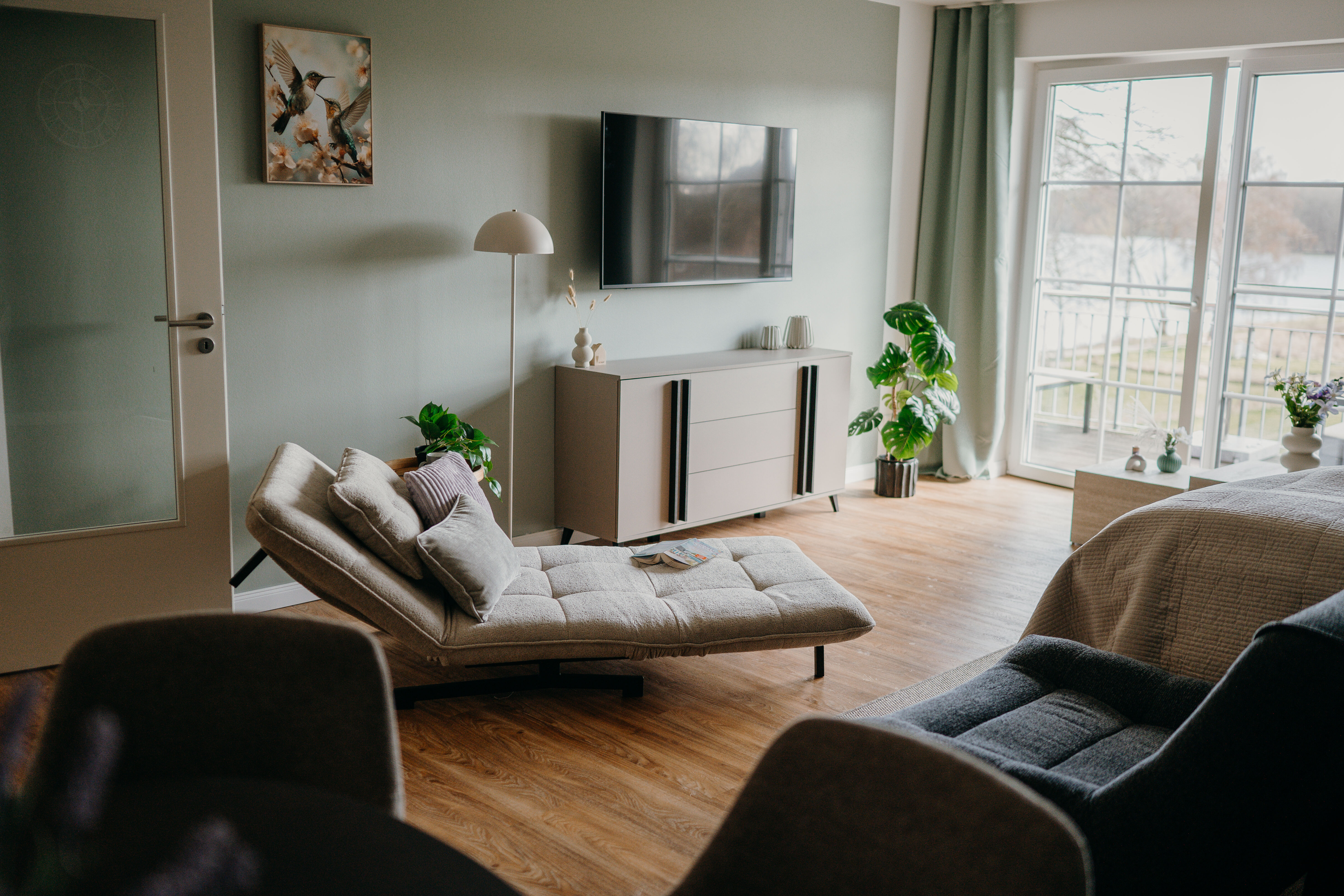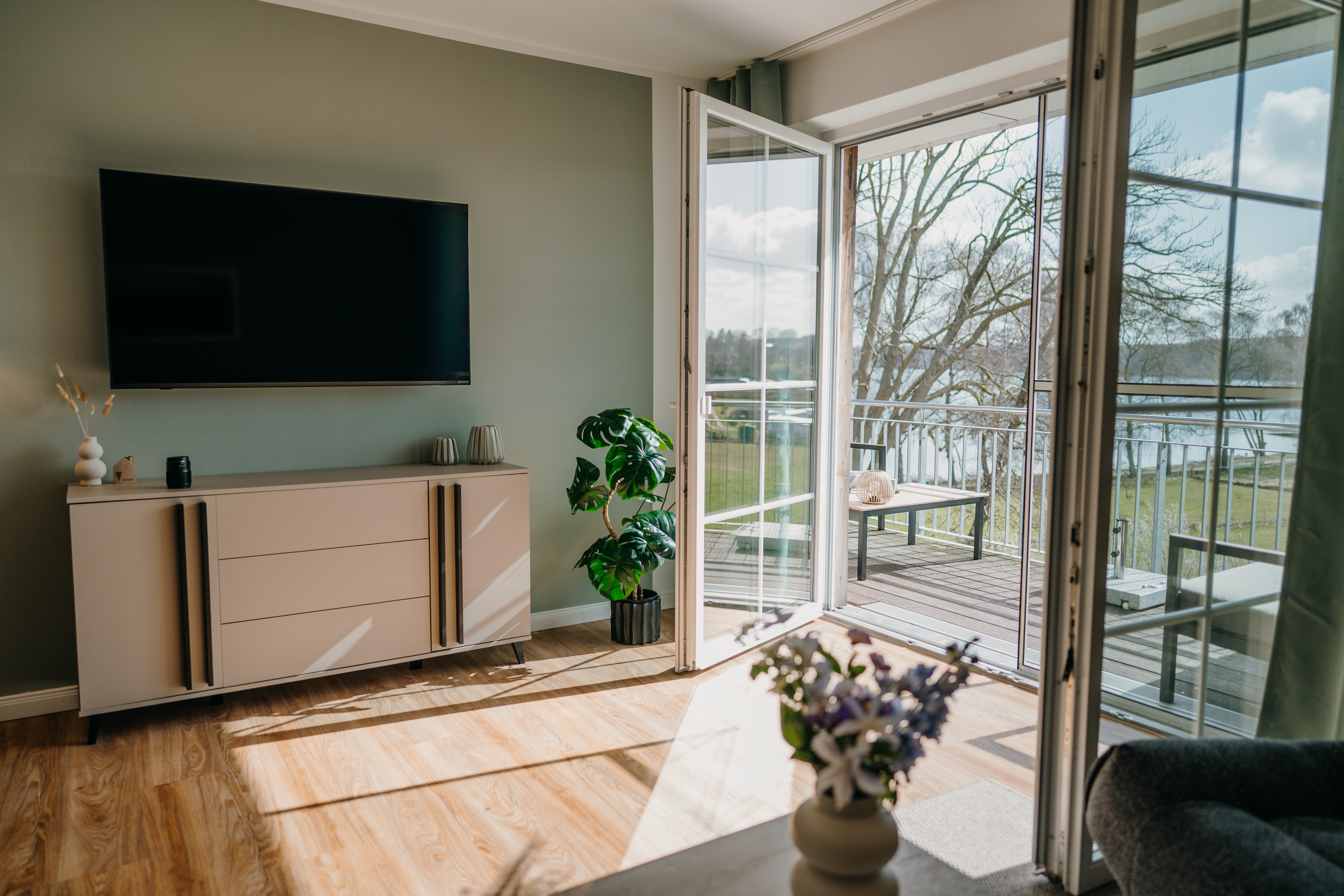 Willkommen in deiner Ferienwohnung am See – ein Ort zum Ankommen, Durchatmen und Wohlfühlen.Eingebettet in die traumhafte Plöner Seenlandschaft erwarten dich Ruhe und Natur pur, kombiniert mit modernem Komfort.Ob erholsame Tage zu zweit, Familienurlaub oder eine Auszeit mit Freunden – hier findet jeder seinen Lieblingsplatz. Barrierearme Gestaltung, ausreichend Raum und liebevolle Details sorgen dafür, dass sich alle Gäste rundum wohlfühlen.Genieße den Seeblick vom Balkon, starte den Tag mit Vogelgesang und entdecke die Natur auf Rad- und Wanderwegen direkt vor der Haustür – dein Urlaubsmoment beginnt hier.Bereits beim Betreten der ca. 80 qm großen, großzügig geschnittenen Ferienwohnung wirst du von dem einzigartigen Blick auf den See begeistert sein.Im Schlafzimmer kannst du es dir nach einem ausgedehnten Spaziergang im komfortablen Kingsizebett (180 x 200 cm) gemütlich machen. Du findest hier ausreichend Platz, um deine Sachen zu verstauen. Auf Wunsch stellen wir dir gerne ein Kinderreisebett zur Verfügung.Ein 43-Zoll Smart-TV ist ebenfalls vorhanden. Das Schlafzimmer lässt sich bei Bedarf abdunkeln.Der helle Wohn- und Essbereich bietet Platz für bis zu 5 Personen. Einen Kinderhochstuhl stellen wir dir auch hier – auf Anfrage – gerne bereit.Die Couch lädt zum Entspannen und gemütlichen Beisammensein mit tollem Seeblick ein und kann im Handumdrehen in ein komfortables Queensizebett mit vollwertiger Matratze verwandelt werden.Ein 100 cm breiter Schlafsessel kann flexibel als gemütliche Leseecke oder zusätzliche Schlafmöglichkeit genutzt werden. Auch das Wohnzimmer lässt sich bei Bedarf abdunkeln.Für entspannte Abende steht dir ein 55-Zoll Smart-TV zur Verfügung.Kostenfreies WLAN ist in allen Räumen vorhanden.In der großzügigen Regendusche (120 x 120 cm) kannst du herrlich entspannen.Eine Waschmaschine sowie ein Trockner stehen dir im großen Waschraum kostenlos zur Verfügung.Die voll ausgestattete Küche befindet sich direkt neben dem Essbereich. Neben ausreichend Geschirr und Kochutensilien findest du hier eine Kaffeemaschine, Toaster, Spülmaschine, Kühlschrank mit Gefrierfach, Backofen und Mikrowelle.Ein kostenloser, zur Ferienwohnung gehörender Parkplatz befindet sich direkt gegenüber vom Gebäude. Ein barrierefreier Parkplatz steht dir bei Bedarf direkt vor dem Haus zur Verfügung.Auch dein vierbeiniges Familienmitglied ist herzlich willkommen (für maximal einen Hund).Zugang für GästeDank der Schlüsselbox ist ein flexibler Self-Check-in möglich, sodass du bei deiner An- und Abreise zeitlich unabhängig bist.
